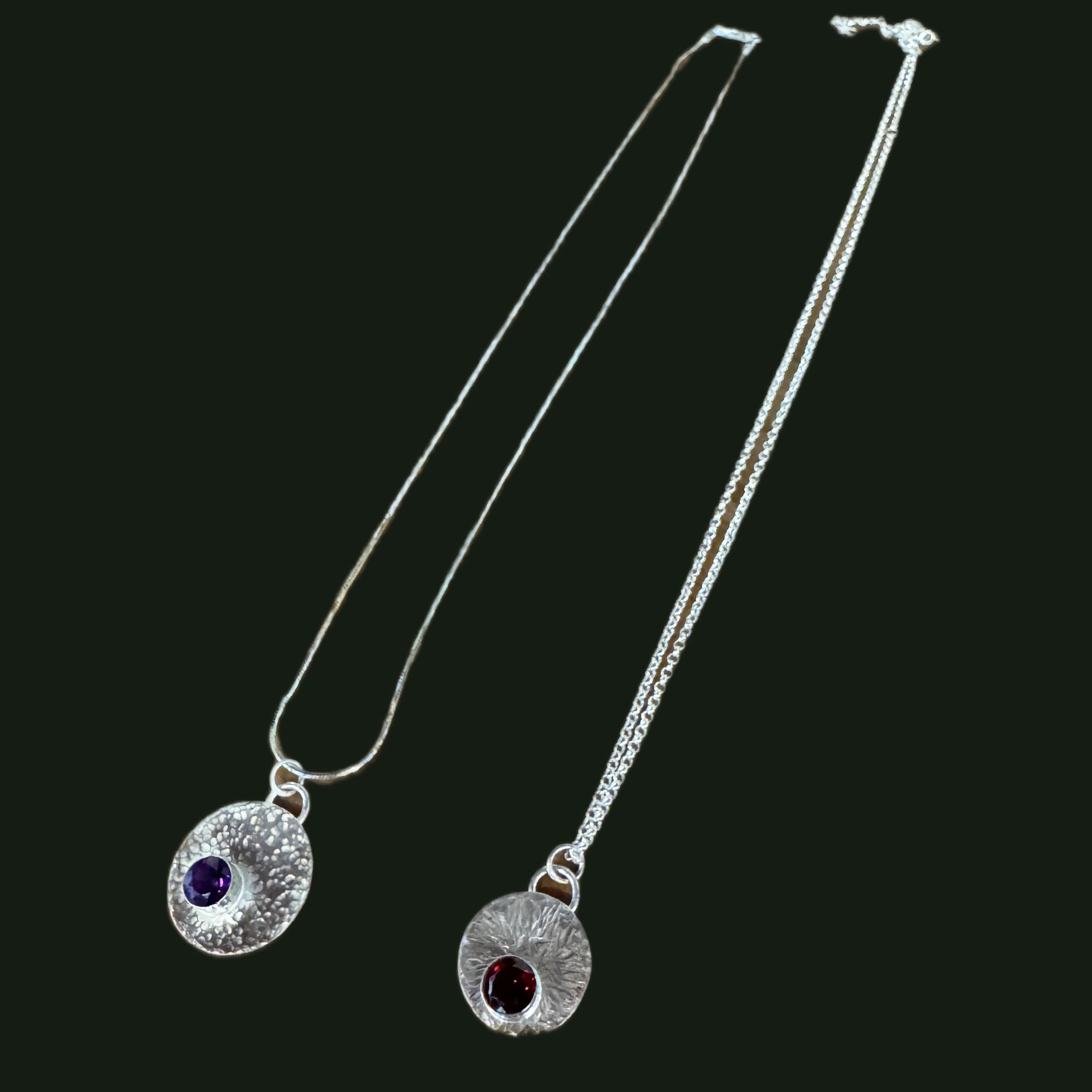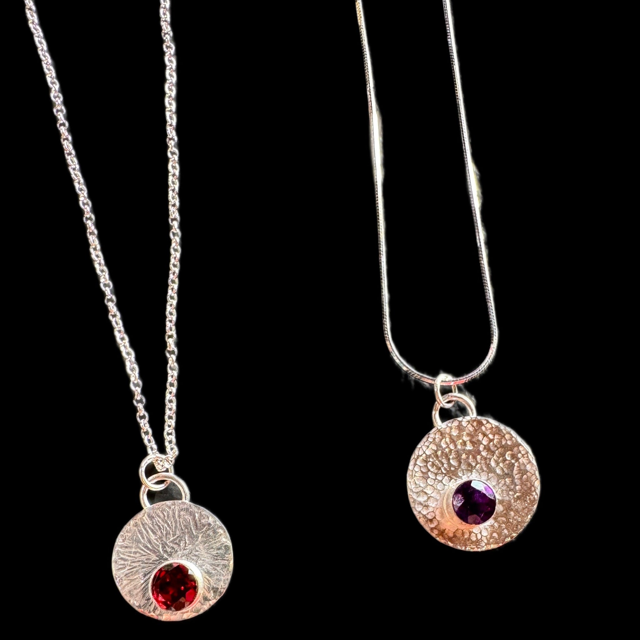 A stunning 17mm silver pendant with a 6mm faceted gemstone of your choice, complete with your own unique textured design. Each pendant includes a pre-made tube setting and comes ready to wear on a silver chain.